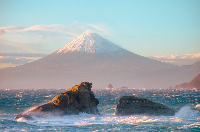 夕刻の雲見海岸から、荒海と富士山。手前の二つ岩は「牛着岩」です。爆弾低気圧が通過した南伊豆を偵察後、夕刻に雲見へ。波、富士、雲と三拍子揃い、これ以上無いほどのシチュエーションになっ...